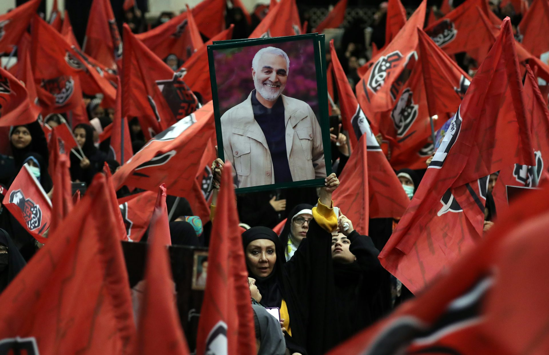 Iranians wave images of Qassem Soleimani during the fourth anniversary of his death in January 2024.