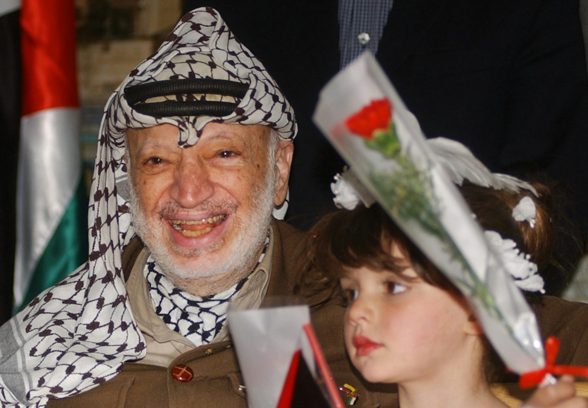 Palestinian leader Yasser Arafat smiles during a meeting at his compound in the West Bank town of Ramallah in 2004.