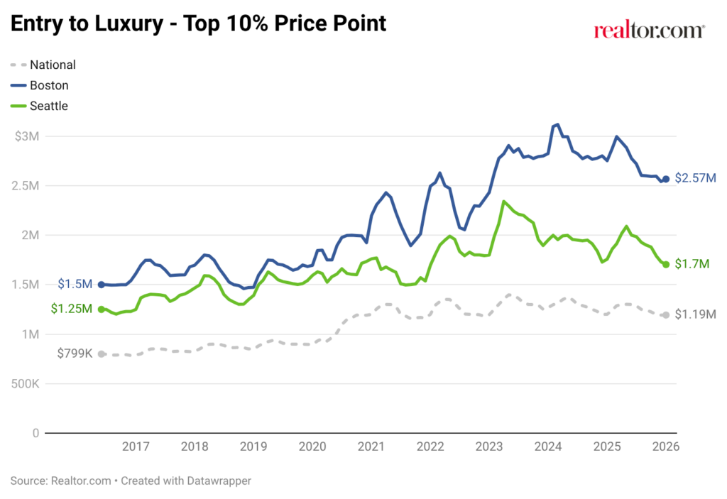 Seattle’s entry point to luxury begins at $1.70 million, a meaningful premium to the national benchmark ($1.19M) and a sign of strong top-tier demand. Boston’s luxury threshold, however, starts at $2.57 million, moving the goal post for the New England hub and placing it in a different pricing tier entirely.