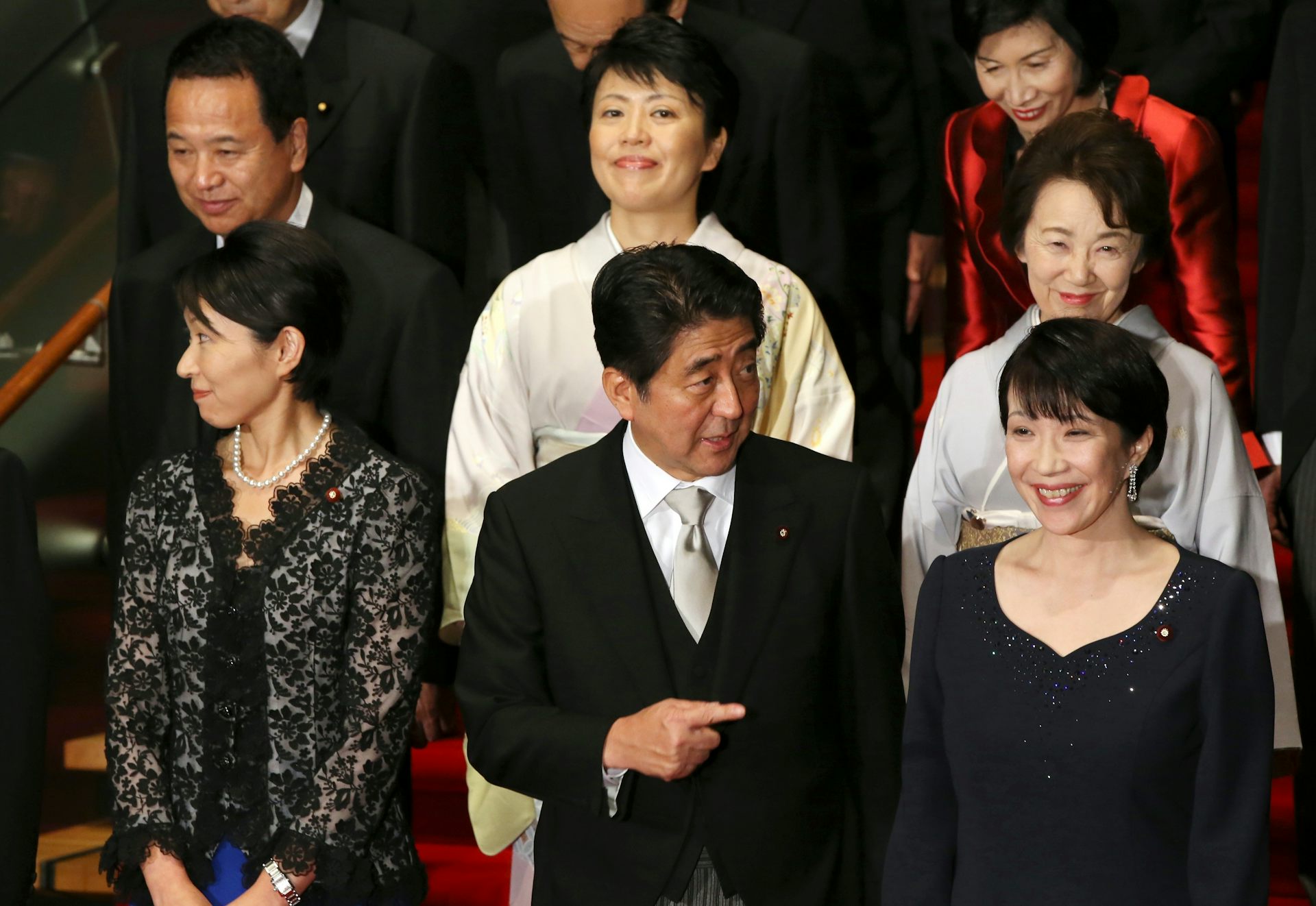Then-Prime Minister Shinzo Abe, centre, poses for a photo with his new Cabinet members, including Internal Affairs Minister Sanae Takaichi, bottom right, at the prime minister’s official residence in Tokyo, September 3 2014.